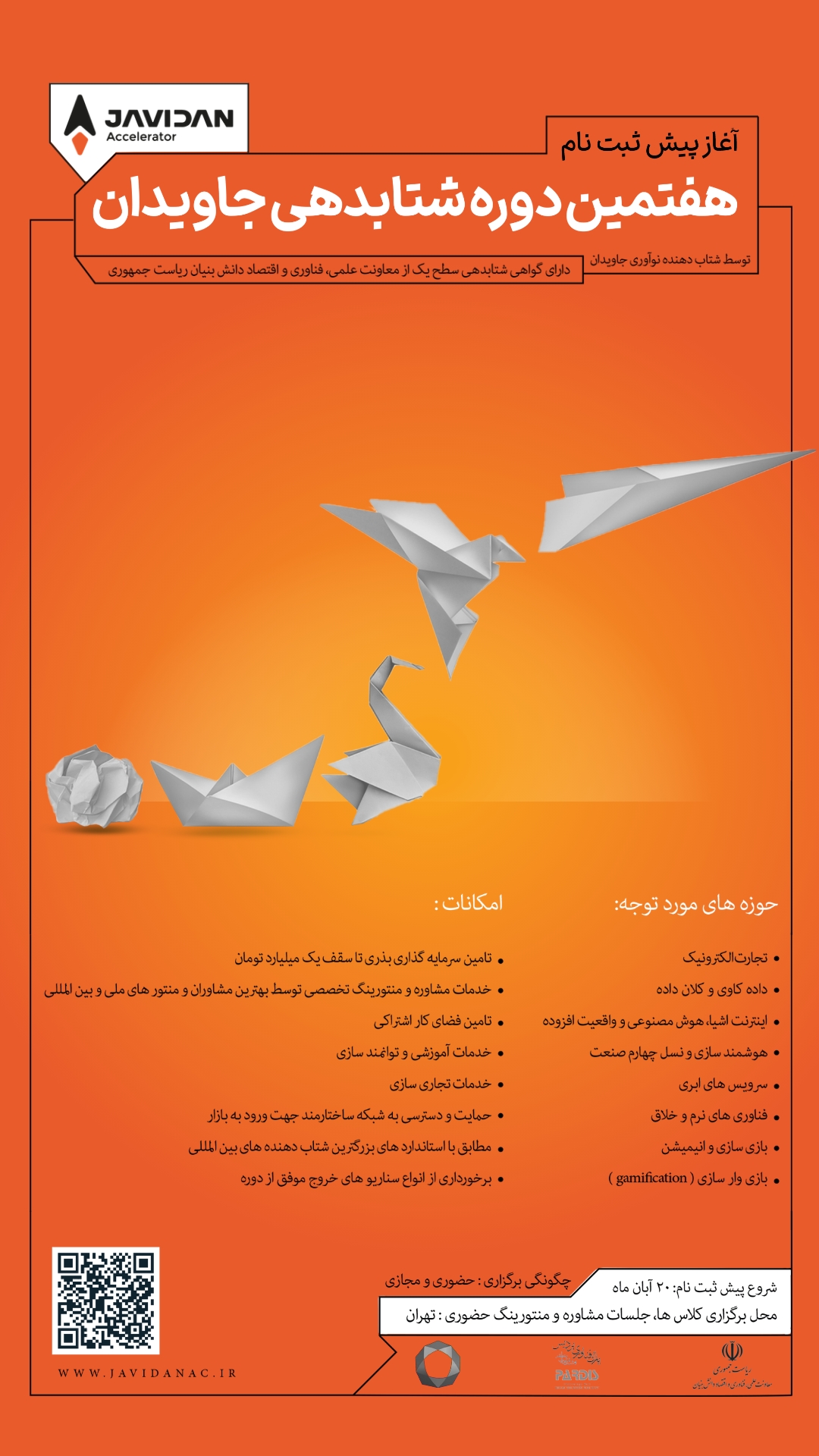 شتابدهنده جاویدان از اعضای مرکز شتابدهی نوآوری پارک فناوری پردیس، به منظور شناسایی تیمهای نوآور و شتابدهی به آنها، پیش ثبت نام هفتمین دوره برنامه شتابدهی خود را آغاز کرده است. این دوره شتابدهی با تمرکز بر حوزه های تجارت الکترونیک، داده کاوی و کلان داده، اینترنت اشیا، هوش مصنوعی و واقعیت افزوده، هوشمندسازی و نسل چهارم صنعت، سرویسهای ابری، فناوریهای نرم و خلاق، بازیسازی و انیمیشن، بازی وری سازی خواهد بود.